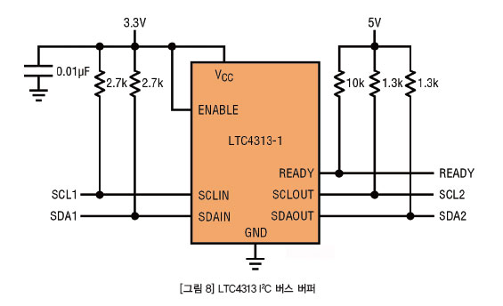 많은 경우에 시스템으로 다중의 I2C 버스 전압 레벨이 사용된다. 기존의 I2C 버스 마스터가 2.5V 또는 1.8V 도메인으로 동작하고 있다면 이것을 LTC2937 핀들의 3.3V I2C 버스 레벨로 연결하지 말아야 한다. 이렇게 하면 디바이스가 손상되거나 동일한 로직 레벨이 아니어서 받지 못할 수 있다. 또 어떤 경우에는 나머지 버스 세그먼트들은 계속해서 작동하는데 일부 버스 세그먼트가 켜지지 않아서 SCL 및 SDA 라인들을 끌어내릴 수 있다. 이럴 때는 LTC4313 같은 버스 버퍼를 사용하는 것이 해결책이 될 수 있다(그림 8).