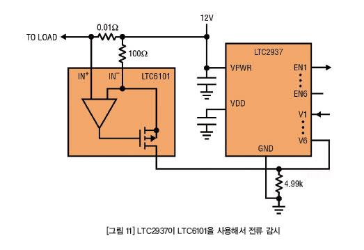 LTC2937은 전압 검출 디바이스이다. 그러므로 입력에서 전압을 검출한다. 하지만 어떤 시스템에서는 전류가 지정된 한계 이내인지를 확인하고 과전류 조건에 응답해야 할 수 있다. LTC6101의 도움을 받아서 LTC2937이 이 일을 할 수 있다(그림 11).
