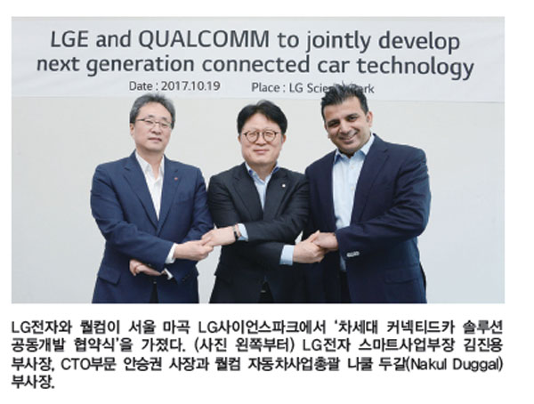 LG전자와 퀄컴은 지난달 19일, 서울 마곡 LG사이언스파크에서 ‘차세대 커넥티드카 솔루션 공동개발 협약식’을 열었다고 밝혔다.