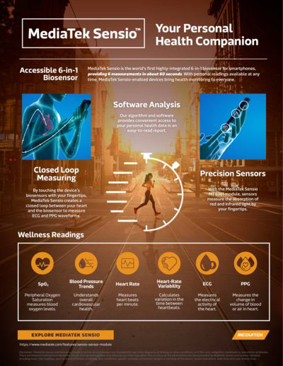 MediaTek Sensio MT6381은 귀중한 건강 데이터를 제공하도록 구체적으로 설계된 포괄적인 소프트웨어 & 모듈 솔루션으로, 광학, 전기 및 처리 요소로 구성된다. 이 솔루션은 커스터마이징을 지원하고 규모가 작기 때문에, 기기 제조업체는 여러 개의 센서를 사용하는 대신 모든 유형의 스마트폰에 바로 MediaTek Sensio 모듈을 삽입하는 유연성을 확보할 수 있다. 그뿐만 아니라 MediaTek Sensio를 도입하면 독자적인 애플리케이션을 개발하거나 제3자 애플리케이션과 개발자 애드온도 이용할 수 있다.