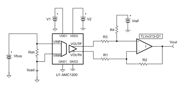 공식 2는 그림 3 회로의 전달 함수로서, R4 = R2 및 R3 = R1이다. AMC1200의 게인은 8V/V이다. Vref를 V2/2로 연결해서 출력을 중간 전원으로 바이어스하면 양방향 전류가 가능하다. 이러한 애플리케이션에는 TLV313-Q1 같은 레일-투-레일 입력/출력(PRIO) 증폭기가 적합하다.