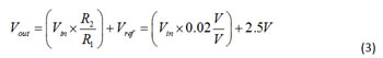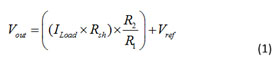 공식 1은 이 회로의 전달 함수로서, R4 = R2이고 R3 = R1이다. 이 애플리케이션의 증폭기는 통상적으로 공통 모드 범위로 접지를 포함한다. 그러나 경우에 따라 공통 모드 전압이 접지와 근접하지 않을 수 있다. 실제로는 션트 저항의 전압(ILoad*Rsh), Vref, R3 대 R4의 비율에 따라 생성되는 전압 분배기에 따라서 좌우되기 때문이다. 그렇기에 게인(R2/R1)은 출력 전압 스윙이 포화되지 않도록 설정해야 한다.