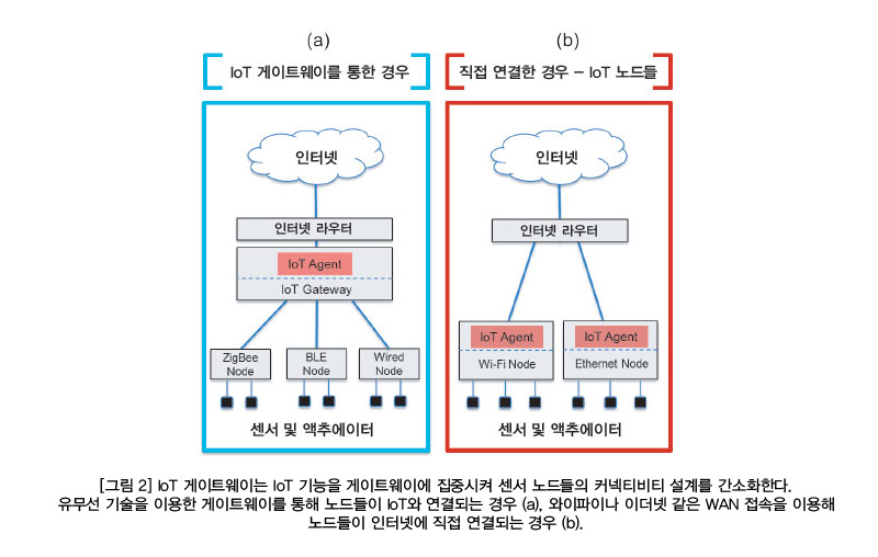 [그림 2(b)]에서 노드는 와이파이 또는 이더넷 같은 WAN 접속을 이용해 인터넷에 직접 연결돼 있다. 게이트웨이는 주로 라우터 역할을 한다. 사실상 노드들이 자체 IoT 에이전트를 가지고 있는 경우, 스스로를 자율적으로 관리하는 라우터일 수 있다.