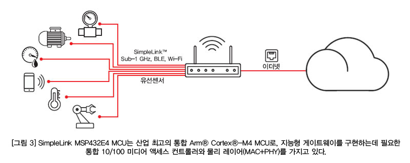 또한 지능형 게이트웨이는 실제로 노드 및 해당 애플리케이션 처리 능력을 증가시킬 수 있다. SimpleLink MSP432E4 MCU를 사용하면 디바이스들을 IoT와 확고하게 연결해주는 게이트웨이를 보다 쉽게 구축할 수 있다. 개발자는 다양한 종류의 엔드 포인트들과 인터페이스들을 지원하는 보안 게이트웨이를 확신을 갖고 설계할 수 있다. 또한 SimpleLink MSP432E4MCU 제품군은 에너지 소비를 최소화하고 시스템 비용은 낮추면서 에너지에 민감한 시스템의 능력은 극대화하도록 설계돼 있다.