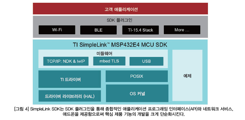 SimpleLink MSP432E4 MCU의 가치는 TI의 광범위한 소프트웨어 제품 및 하드웨어 포트폴리오와 통합이다. TI의 목표는 IoT 디바이스 및 게이트웨이 설계를 가능한 쉽게 만드는 것이다. SimpleLink SDK는 TI 실시간 운영시스템(TI-RTOS), TI 드라이버에서의 기능 추출, 대다수 애플리케이션 레벨의 미들웨어 솔루션 등을 비롯한 기초 레벨의 종합적인 소프트웨어 프레임워크를 제공한다(SimpleLink SDK의 레이어에 관한 보다 자세한 내용은 “소프트웨어 개발 간소화로 투자수익률의 극대화” 백서 참조).
