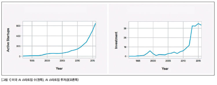 이런 AI의 발전을 잘 보여주는 것이 바로 AI 관련 스타트업의 증가와 관련 스타트업에 대한 투자 증가다. AI INDEX가 2017년 11월 발표한 자료에 따르면 미국 내 AI 스타트업과 관련 투자의 증가를 보면 모두 2010년 이후 큰 폭으로 상승하기 시작했다. AI 스타트업은 2000년 이후 14배가 증가했고, AI 스타트업에 대한 투자도 2000년 이후 6배가 늘었다. AI와 관련된 연구 개발과 제품 개발에 대한 투자는 더욱 늘어날 전망이다.