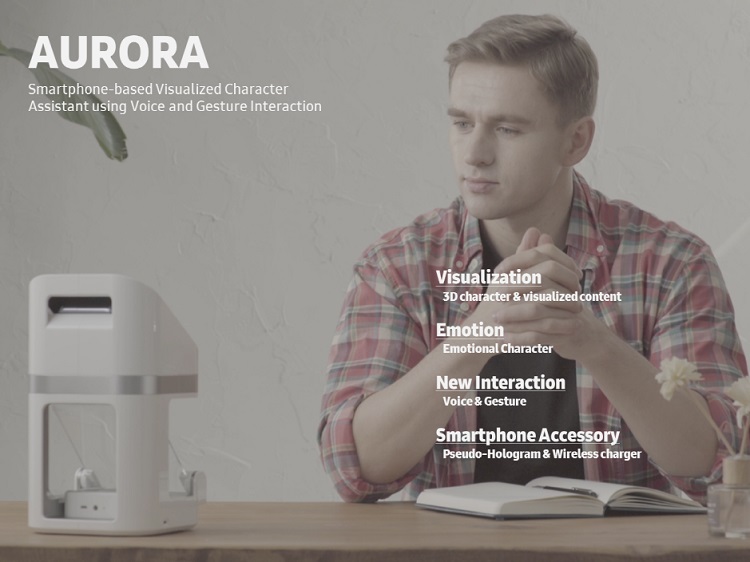 '오로라'는 보이는 음성 비서로, 해당 디바이스에 스마트폰을 거치하면 유사 홀로그램 형태의 귀여운 캐릭터인 '오로라'가 나타나 사용자와 대화하듯이 표정과 동작을 지으며 음성 비서 기능을 수행한다.