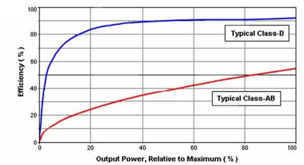 그림 2: 클래스 AB 대 클래스 D의 효율 비교 (출처: http://www.audioholics.com)