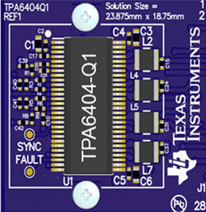 금속 합금 3.3mH 인덕터를 사용하고 신호가 곧바로 통과하도록 설계됨으로써 업계에서 가장 소형화된 크기의 4채널 자동차 클래스 D 증폭기 크기를 달성할 수 있다. 그림 5는 TPA6404-Q1을 사용한 전체적인 솔루션(증폭기와 모든 필요한 수동 소자 포함)의 크기가 불과 4.5cm2밖에 되지 않는다는 것을 알 수 있다.