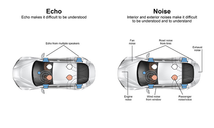 차량 내에서 통화할 때 울림이나 소음이 발생하면 의사 소통 하기가 어렵다. 차량 내 스피커가 수신 전화에서 나오는 음성 신호를 전송하면 이 신호가 바로 차량 내에서 튕겨져 나와 마이크로 돌아가면서 울림이 발생한다. 이 때문에 발신자는 자신의 목소리만 들려 제대로 통화를 할 수 없게 된다. 또한, 팬이나 배기 장치, 타이어, 창문 및 승객 등에서 발생하는 도로 소음이 전화로 침투해 의사 소통을 방해하며, 이는 산만한 주행 및 불편한 경험으로 이어진다.