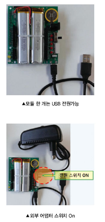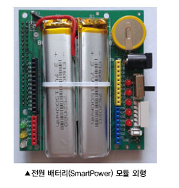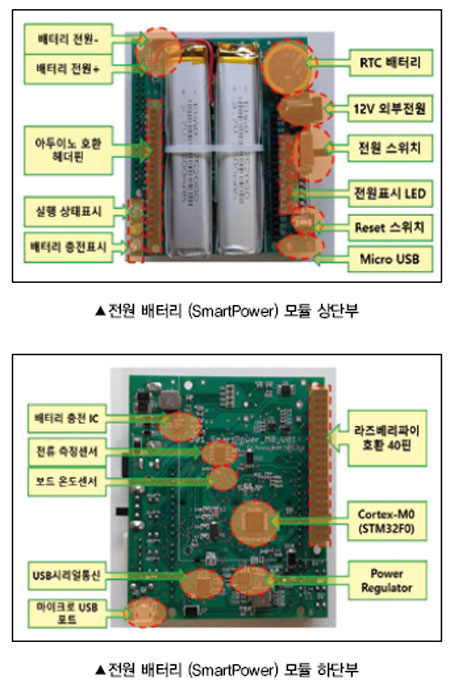 커널연구회에서 보드를 설계하여 제작한 SmartPower 모듈의 외형은 아래 사진과 같다. 이 보드는 라즈베리파이 40핀 I/O핀에 장착할 수 있고, 아두이노 헤더핀과도 호환된다. 외부에 12V 전원 어댑터 연결잭을 통하여 전원을 공급하고, 보드 상단에 장착되어 있는 배터리를 충전할 수 있다. 12V 외부 전원과 배터리를 모두 사용할 수 있고, 여기에 적층 형태로 장착되는 라즈베리파이, 아두이노, 무선통신모듈, 센서, 모터, 카메라, 사운드 모듈 등에 전원을 공급하고 On/Off 스위칭한다.