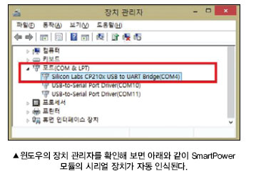 커널연구회는 SmartPower 모듈에 USB 시리얼(UART) 장치로 Silicon Labs사의 CP2102 IC를 사용했다. 이 장치는 PC에 기본적으로 드라이버가 설치되어 있으므로 별도로 드라이버를 설치하지 않아도 자동으로 인식된다.