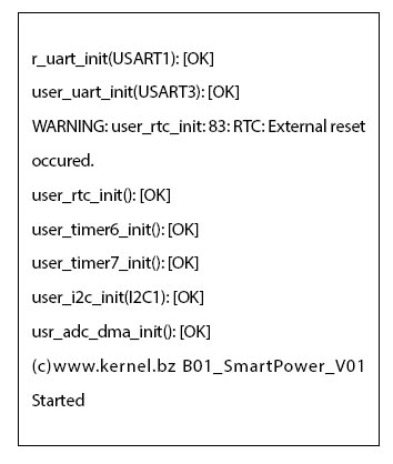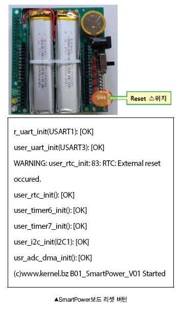 위와 같이 시리얼통신 옵션들을 설정한 후, SmartPower 보드의 리셋 버튼을 한번 눌러주면 minicom 시리얼 터미널 화면에 아래와 같은 메시지들이 출력되면서 동작을 시작한다.