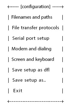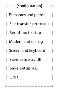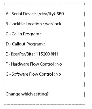 시리얼통신 포트가 위와 같이 /dev/ttyUSB0로 설정되어 있지 않고, 통신 속도(baud rate)도 115200으로 설정되어 있지 않다면, 키보드에서 Ctrl-A를 누른후 O 키를 눌러서 다음과 같이 옵션 설정 메뉴로 진입한다.