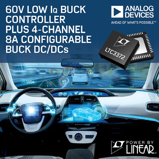 LTC3372는 60V 동기식 벅 스위칭 레귤레이터 컨트롤러에 4개의 구성 가능형 동기식 모놀리식 벅 레귤레이터가 결합된 것이 특징이다. 신제품은 이러한 조합을 통해 낮은 대기전류, 고효율, 최대 5개까지의 출력을 단일 IC에서 제공하기 때문에 자동차, 산업용 및 의료용 애플리케이션에 매우 적합하다.
