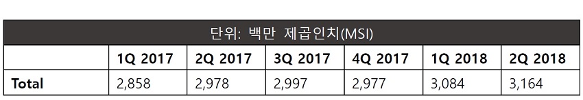 이는 전 분기 30억 8,400만 제곱인치에서 31억 6,000만 제곱인치로 늘어난 수치로 새로운 분기별 총 면적 출하량은 2017년 2분기 출하량 대비 6.1% 높다.