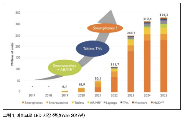 마이크로 LED 디스플레이는 2019년 스마트폰, 스마트워치부터 시장을 형성해 나갈 전망이며 2021년 이후 태블릿, AR/VR, 노트북, TV, 모니터로 확대할 것으로 보인다. 판매대수로는 2020년 1900만 대에서 2025년 3억2900만 대에 이를 것으로 예상된다.