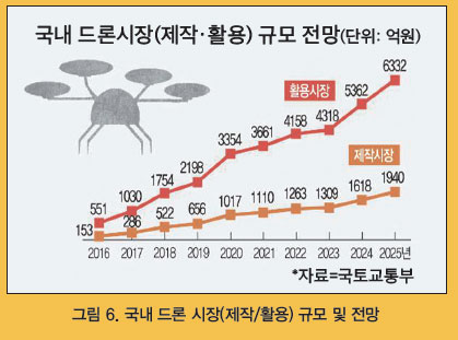 2016년 기준 세계 드론 제조사는 49개국, 총 247개사로 파악되며 미국 제조사가 47개사로 전체의 19%를 차지하며, 한국은 전체의 1.6%를 차지하여 기술 개발이 필연적이다. 정부에서는 드론 기술을 국토교통부 7대 신산업 육성 중 하나로 선정하고, '드론산업 발전 기본계획'을 발표하여 투자할 계획이다.