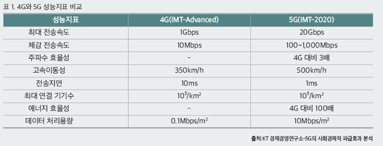 5G는 4세대 이동통신인 LTE보다 약 20배 이상 빠른 5세대 이동통신 서비스(5th generation mobile communications)를 의미한다. 국제전기통신연합(ITU)은 5G의 공식 기술 명칭을 ‘IMT-2020’으로 정하며, 2020년 상용화를 목표로 삼는 모바일 국제 표준으로 정했다.