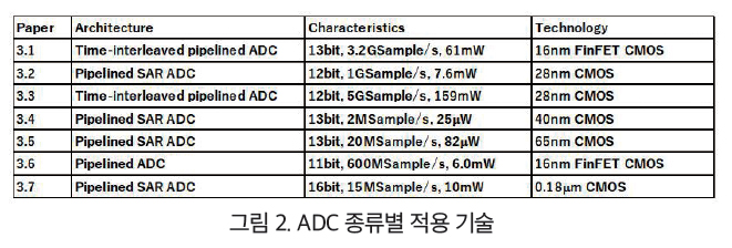 하이라이트 논문으로는 KU Leuven의 28nm CMOS 공정에서 설계된 5G 통신을 위한 저전력 기가헤르츠(GHz) ADC 주제를 꼽을 수 있다. 이 ADC는 8x interleaved hybrid multi-stage pipelined-SAR ADC 구조이며, 9.4b-ENOB, 5GS/s에서 기존 기가헤르츠 ADC에 비하여 훨씬 적은 전력인 158.6mW를 소모(Walden FoM: 46.1fJ/conversiton-step)한다고 보고했다.
