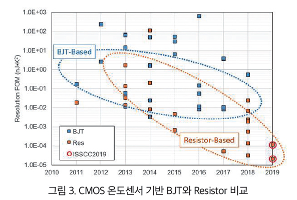 CMOS 온도센서의 트렌드로는 저항기반의 온도센서가 기존의 BJT 기반의 온도센서의 성능을 상외하는 논문이 발표됐다. 우수한 변환효율, BJT와 유사한 1-포인트 보정 후 정확도(3 sigma < 0.4℃)를 나타낸다.