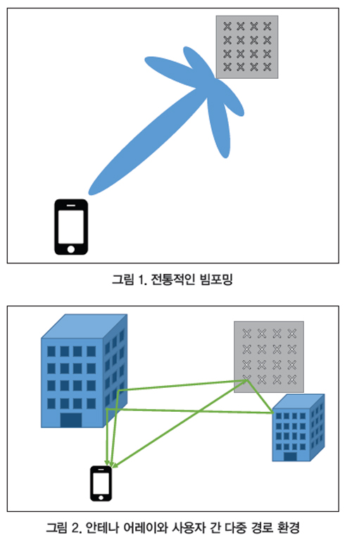 효율을 높일 수 있는 방법 중 하나는 여러 개의 안테나로 구성되는 기지국을 설계함으로써, 공간적으로 분리된 여러 사용자 단말기들이 동일한 주파수 자원에서 동시에 통신하고 다중경로로 전파할 수 있게 하는 것이다. 이러한 기술을 흔히 ‘매시브 MIMO(multiple-input, multiple-output)’라고 부른다. 매시브 MIMO를 여러 개의 안테나를 사용하는 빔포밍(beamforming)으로 기술하는 것을 들어 본 적이 있을 것이다. 그렇다면 빔포밍이란 무엇일까?