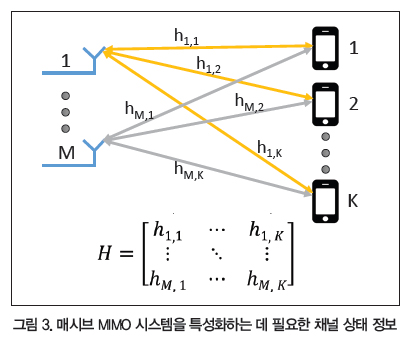 다중 경로를 이용하기 위해서는 안테나 소자와 사용자 단말기 사이의 공간 채널을 특성화할 필요가 있다. 자료에서는 이러한 응답을 일반적으로 채널 상태 정보(CSI)라고 한다. 이 CSI는 각 안테나와 각 사용자 단말기 간 공간 전달 함수를 효과적으로 모아놓은 것이다. 그림 3에서 보듯이 이러한 공간 정보는 행렬 (H)에 수집된다. 다음 섹션에서 CSI의 개념과 어떻게 이를 수집하는지 자세히 살펴볼 것이다. CSI는 안테나 어레이로부터 송수신되는 데이터를 디지털로 인코딩 및 디코딩하는 데 사용된다.