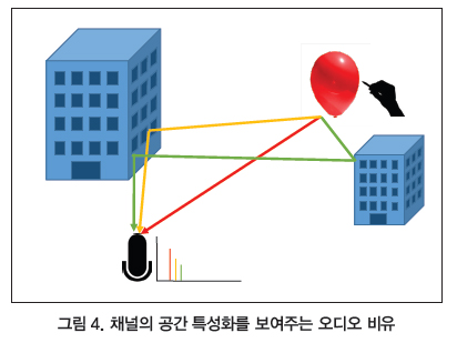 비유를 통해 설명해 보기로 하자. 그림 4에서 보는 것처럼 한 위치에서 풍선이 터지고, 다른 위치에서 이 풍선이 터지는 소리나 임펄스를 녹음한다고 하자. 마이크 위치에서 녹음되는 소리는 주변 환경에서 풍선과 마이크가 위치한 각각의 주변 환경에 대한 고유 정보를 포함하는 공간적 임펄스 응답이다. 장애물에 반사되는 소리는 직접 경로에 비해 감쇠되고 지연된다.