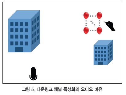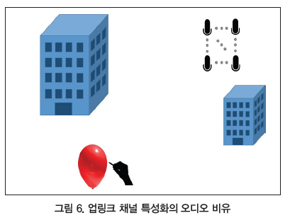 안테나 어레이/사용자 단말기 경우와 비교하기 위해 앞서 소개한 비유를 확장한다면, 그림 5에서 보듯이 더 많은 풍선이 필요하다. 각 풍선과 마이크 사이의 채널을 특성화하려면 중첩되는 서로 다른 풍선의 반사가 마이크에 녹음되지 않도록 각각의 풍선을 서로 다른 시간에 터뜨려야 한다. 또한 그림 6에서처럼 다른 방향도 특성화해야 한다. 이 경우, 사용자 단말기 위치에서 풍선을 터뜨리면 모든 녹음을 동시에 수행할 수 있다. 이렇게 하면 작업 시간은 확실히 짧아진다.