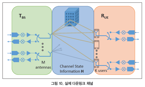 앞서 시스템에 가역성을 적용하면 채널 추정과 신호 처리 오버헤드를 현저히 줄일 수 있다고 설명했다. 그림 10은 실제 시스템의 다운링크 채널을 보여준다. 채널은 세 가지 구성요소인 무선 채널(H), 기지국 송신 RF 경로(TBS)의 하드웨어 응답, 사용자 단말기 수신 RF 경로(RUE)의 하드웨어 응답으로 나뉜다.