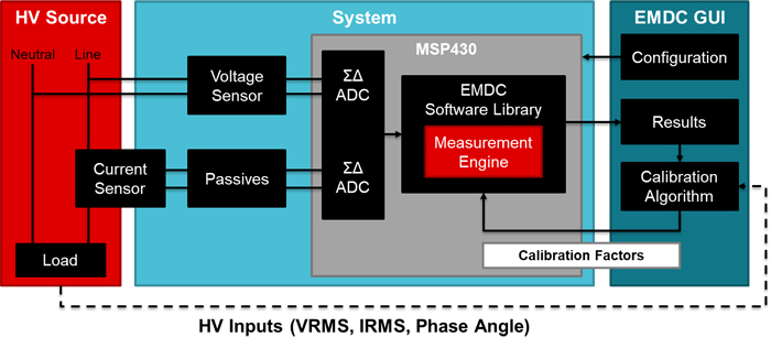 그림 4는 임베디드 미터링 시스템의 세 가지 주요 구성요소를 보여준다. 첫째, 고전압 소스는 정확한 테스트 장비 또는 AC 주 전원이 될 수 있다. 다음으로, 시스템은 MCU와 센서를 포함하는 평가 모듈 또는 커스텀 보드가 될 수 있다. 마지막으로, GUI 또는 호스트 MCU는 시스템의 MCU를 제어하고 통신한다. 여기서 EMDC GUI는 소프트웨어 라이브러리를 구성하면서 CPU 대역폭을 추정하고, 구성 오류 검사, MCU를 위한 소스 코드 생성, 시스템 보정을 수행하고 결과를 표시한다. 이 모든 것이 한 줄의 코드도 작성할 필요 없이 실행된다.