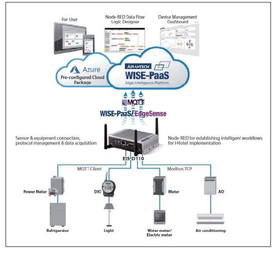 게다가 EIS는 WISE-PaaS/EdgeSense 패키지로 구성된 IBM의 NodeRED 플로우 로직 에디터와 사전 설치되었습니다. 이것은 지능형 호텔 구현을 위한 작업 흐름을 신속하게 구축하고 모든 종류의 시나리오 어플리케이션을 위한 엣지 인텔리전스를 실현하기 위해 사용됩니다