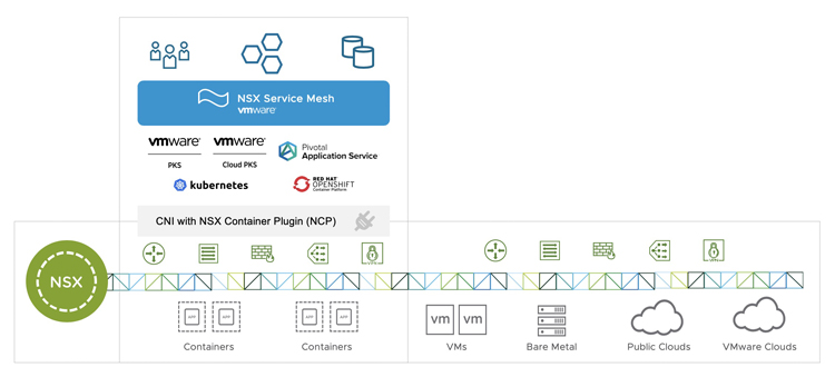 VMware NSX Service Mesh는 쿠버네티스 클러스터 온보딩을 간소화하며, 다수의 클라우드와 쿠버네티스 클러스터를 연합한다. 이를 통해 VMware NSX 포트폴리오 및 플랫폼에 연결할 수 있으며, 통합된 정책, 네트워크 서비스, 가시성 도구를 구성할 수 있다.