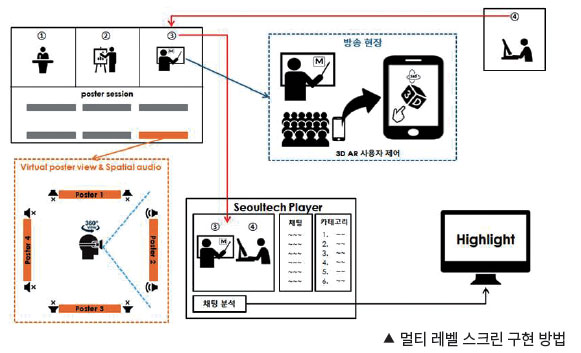 깊이 인식 카메라 기반의 사용자 제스처 인식 및 콘텐츠 제어가 가능하고, 개인방송 플랫폼 구성을 통한 멀티레벨 디스플레이 기반의 실시간 스트리밍이 가능한 실감시청 체험 제공 기술