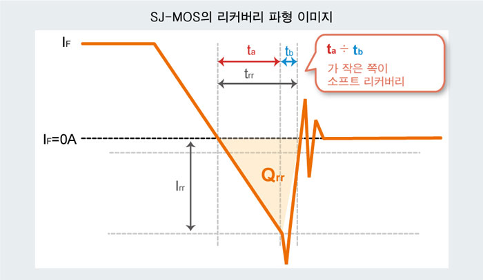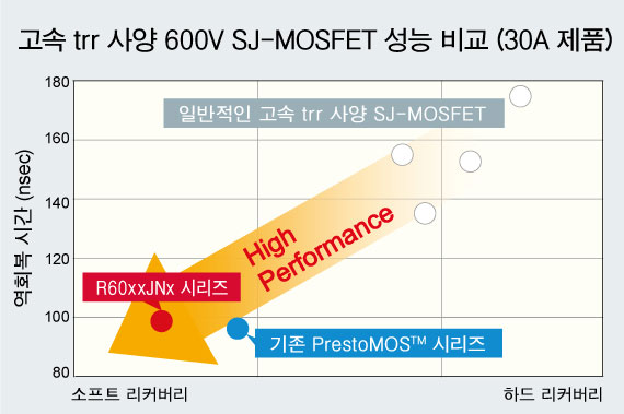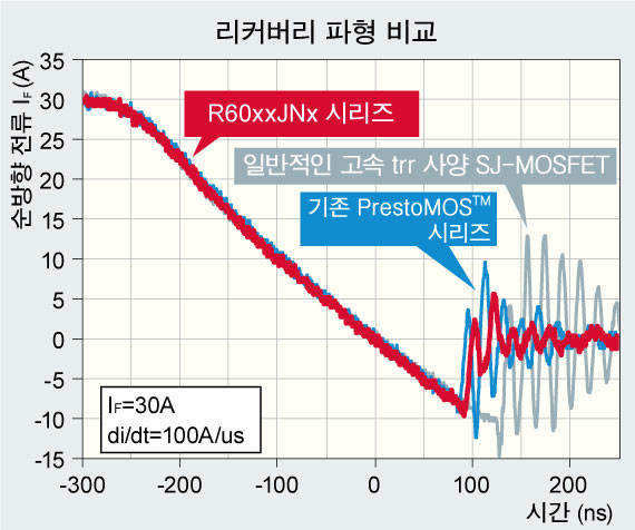 일반적으로, SJ-MOSFET의 내장 다이오드에 있어서 리커버리 특성은 하드 리커버리이다. 그러나 로옴의 R60xxJNx 시리즈는 구조를 최적화함으로써, 기존품 대비 소프트 리커버리 지수를 30% 개선하여, 업계 최고 속도의 역회복 시간 (trr)을 유지함과 동시에, 노이즈를 저감하는데 성공했다. 이에 따라, 고객 측에서의 게이트 저항 등을 통한 노이즈 조절이 용이해진다.