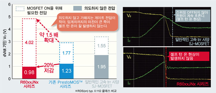 스위칭 속도의 고속화와 셀프 턴 온 현상, 노이즈 발생은 트레이드 오프 관계이므로, 고객은 회로 설계 시 게이트 저항 등을 조정함으로써, 이러한 사항을 최적화할 필요가 있다. 로옴의 R60xxJNx 시리즈는 셀프 턴 온 현상 및 노이즈 대책을 실시하여, 일반품인 고속 trr 사양의 SJ-MOSFET에 비해 고객의 설계 자유도 향상에 기여한다.