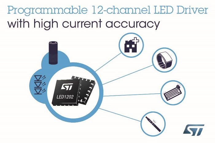 ST마이크로일렉트로닉스(STMicroelectronics, 이하 ST)가 ‘컬러 체이싱(Color-Chasing)’이나 ‘딥 브리딩(Deep Breathing)’과 같은 LED 애니메이션 효과에서 인위적 산란요소를 방지해주는 특허 기능을 활용해 12채널 LED 드라이버 LED1202를 출시했다.