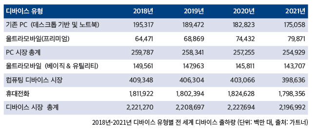 가트너(Gartner)가 발표한 2019년 전 세계 디바이스 출하량 전망에 따르면 2019년 PC, 태블릿, 휴대전화를 포함한 디바이스의 전 세계 출하량은 22억 1천만 대를 기록하며 작년과 비슷한 수준을 유지할 것으로 보인다.