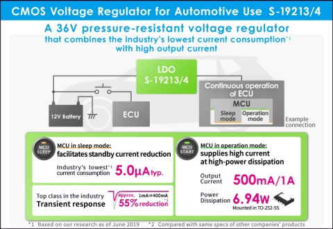 신형 자동차 LDO 조절기 시리즈 S-19213/4의 사양은 36V(45V 레이팅) 입력, 1.8 - 30V 출력, 5.0μA 자체 전류 소비, 125℃ 운영과 500mA (S-19213)/ 1000mA (S-19214) 출력 전류다.