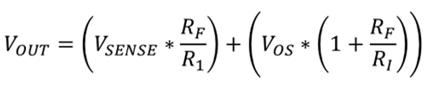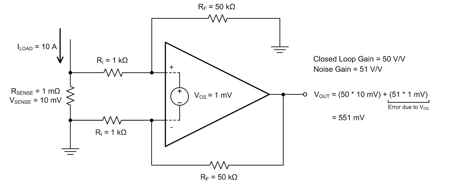 그림1. 차동 증폭기 구성에서 연산 증폭기로 전류 감지. 잡음 이득으로 입력 오프셋 전압이 증폭되어 출력에서 오프셋 오차를 만들어 내기 때문에 낮은 오프셋 전압이 매우 중요하다.