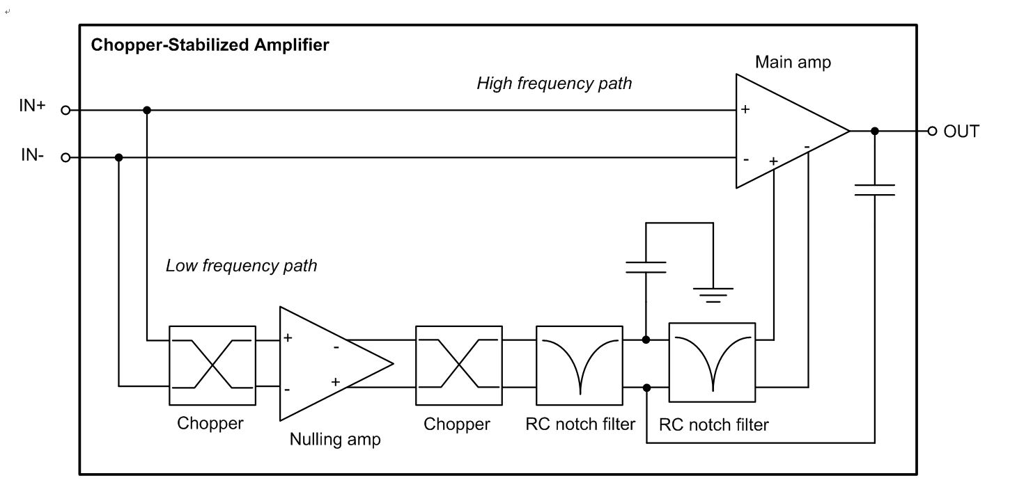 정밀 연산 증폭기는 ‘제로 드리프트’ 오프셋 전압을 달성할 수 있어서, 여러 방법을 통해 온도가 변화고 시간이 지나도 입력 오프셋 전압을 낮게 유지한다. 증폭기가 이를 달성할 수 있는 방법 중 하나가 입력 오프셋 전압을 정기적으로 측정하고 출력에서 오프셋을 수정하는 설계 기법을 이용하는 것이다. 이런 유형의 아키텍처를 초퍼 안정화라고 한다.