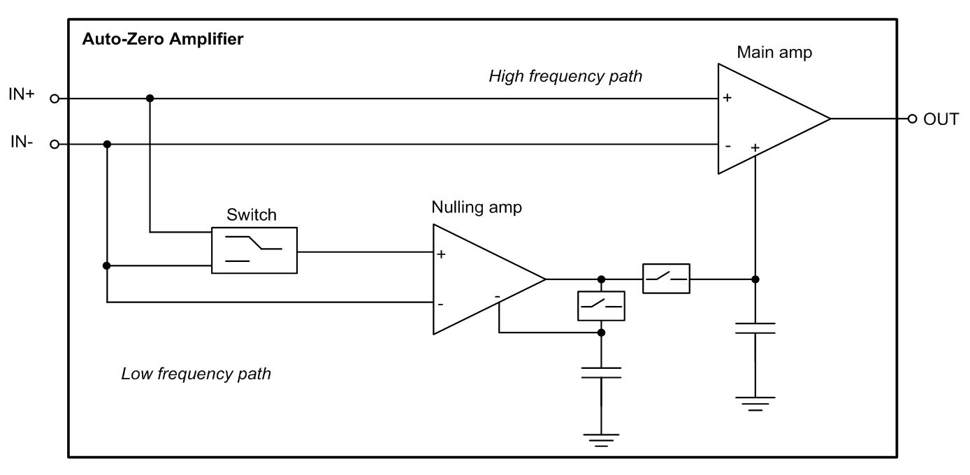 그림 2에서, 저 신호 경로는 초퍼가 입력 오프셋 전압을 샘플하는 곳이고, 그 다음에 출력에서 오프셋을 보정하기 위해 사용된다. 이 보정 주파수는 증폭기의 전체 대역폭 안에 있다. 이런 유형의 아키텍처는 샘플링 방법을 사용하기 때문에 최적 성능은 입력 신호 주파수가 관련 나이퀴스트 주파수보다 낮을 때 발생한다.