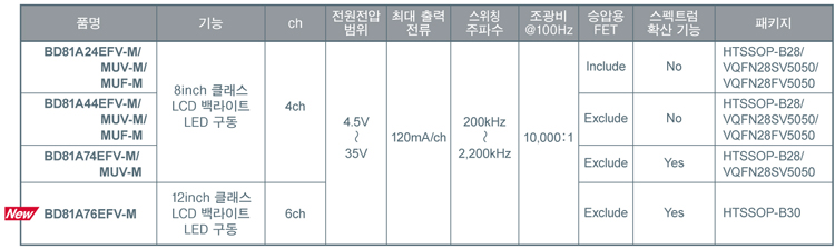 BD81A76EFV-M은 12inch 클래스의 LCD 판넬에 대응 가능한 6ch 출력(120mA/ch)의 오토모티브 LCD 백라이트용 LED 드라이버 IC다. 기존의 4ch 출력 제품은 8inch 클래스의 LCD 판넬 어플리케이션까지만 대응할 수 있었지만, 이 제품은 10~12inch 클래스의 어플리케이션에 대응할 수 있다.