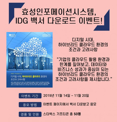 통합 ICT 인프라 솔루션 전문 기업 효성인포메이션시스템(대표 정태수)이 20일까지 ‘하이브리드 클라우드 백서’ 다운로드 이벤트를 진행한다.