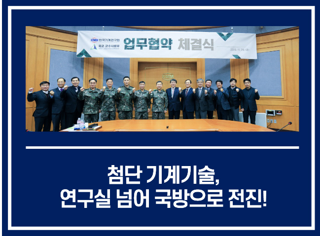 한국기계연구원(원장 박천홍, 이하 기계연)이 육군, 해군, 공군을 아울러 국방 분야의 다각적인 민군기술협력 네트워크를 구축하고 첨단 기계기술의 국방 활용에 속도를 낸다.