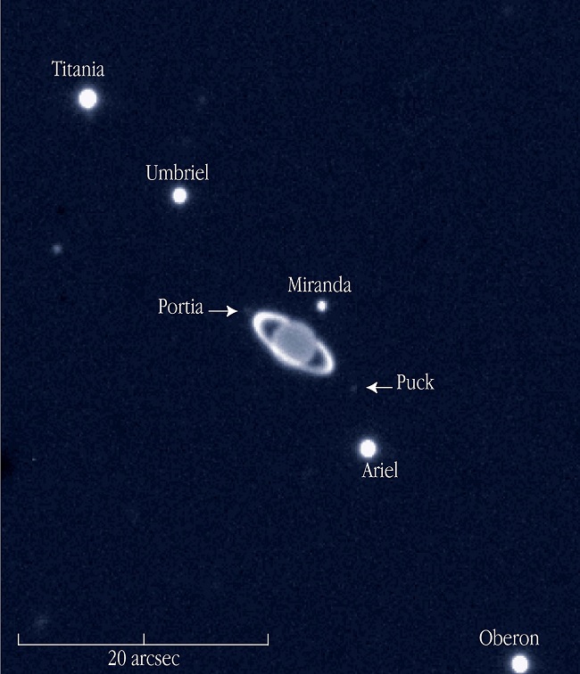 오베론과 고리가 뚜렷하게 보이고, 고리의 양 끝에 포르티아(고리 왼쪽 끝)와 퍽(고리 오른쪽 끝)이 희미하게 보인다(사진출처: ESO 홈페이지).