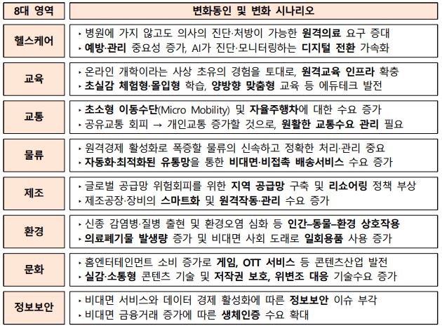 또한 두 번째 단계로, 향후 4대 환경변화에 의해서 큰 변화가 예상되는 사회·경제 영역으로, △헬스케어 △교육 △교통 △물류 △제조 △환경 △문화 △정보보안 등 8개 영역이 선정되었다. 이 같은 영역을 기반으로 △건강관리와 원격의료 중심의 의료시스템 변화, △다양한 비대면·원격 서비스의 편리성·효과성·보안성 향상, △교통·물류·제조 등 산업영역의 자동화·지능화 등이 주요 이슈로 대두되고 있다.