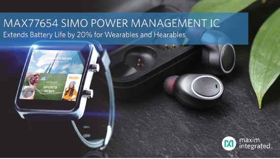 MAX77654 초저전력 전력관리IC(PMIC)는 단일 인덕터 다중 출력(SIMO) 벅 부스터(buck-boost) 레귤레이터와 100mA LDO 2개, 소형 Li+ 배터리용 전력 경로 충전기를 탑재했다.