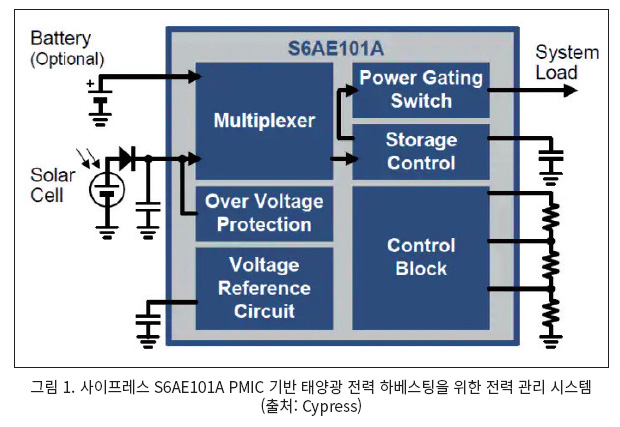 연결된 부하에 맞춰 수확된 에너지를 조정하고 안정적인 전원 공급을 유지하려면 에너지 하베스팅 디바이스는 일정한 형식의 전력 관리 IC(PMIC)를 포함할 필요가 있다. 초저전력을 요구하는 곳에 사용하도록 설계된 사이프레스(Cypress) S6AE101A 에너지 하베스팅 PMIC는 각각 단 250nA 및 1.2μW의 동작 전류와 스타트업 전력을 필요로 한다.