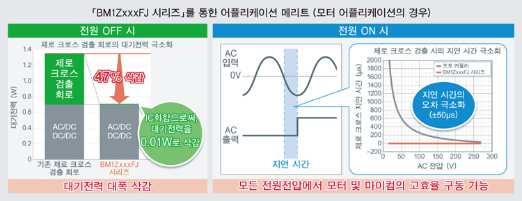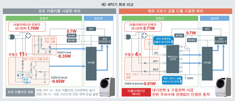 기존의 제로 크로스 검출 회로는 포토 커플러 및 트랜지스터로 구성되었으며, 그 대기전력은 어플리케이션 전체의 1/2정도를 차지했다. 로옴은 전 세계 수백가지 패턴의 전원과 환경을 분석함으로써, 포토 커플러가 없어도 제로 크로스 검출이 가능한 IC를 실현하여, 부품수 삭감과 더불어 제로 크로스 검출 회로에서의 대기전력을 극소화 (0.01W)하였다. 또한, 모터 어플리케이션의 경우, 모터 입력전압 검출 회로도 삭감할 수 있으므로, 한차원 높은 대기전력 삭감과 부품수 삭감이 가능하다.